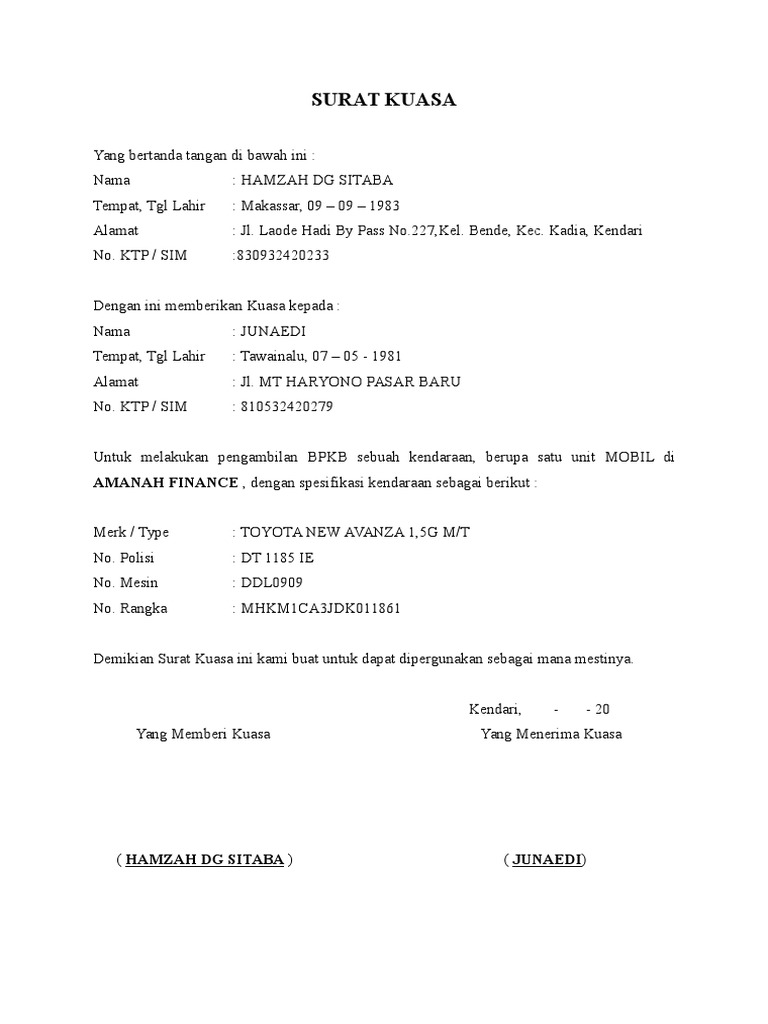 Jangan khawatir, yuk simak contoh surat kuasa pengambilan bpkb di sini! Diatas adalah beberapa contoh surat kuasa pengambilan bpkb yang sudah terisi dengan lengkap. Yangbe r t andat ang andibawahi ni: Kebanyakan surat kuasa pengambilan bpkb termasuk surat kuasa perseorangan, karena dibuat oleh seorang. Jika kalian menginvestasikan barang, kalian juga akan mendapatkan surat kuasa ini. Jika hal ini terjadi, pemilik kendaraan harus menuliskan surat kuasa agar dokumen bpkb dapat diambil dan tidak disalahgunakan oleh orang lain. Namun jika anda tidak ingin repot, maka anda bisa memilih format di bawah ini. Download file blangko contoh surat kuasa pengambilan bpkb motor dan mobil dalam format word gratis tinggal edit untuk berbagai leasing di indonesia. Surat kuasa merupakan sebuah surat yang menyatakan pemberian wewenang untuk melakukan sebuah kegiatan dari pemberi kuasa kepada penerima kuasa yang keduanya menyertakan bukti sah dengan pernyataan disertai dengan materai atau tanda tangan sebagai bukti. Namun yang terpenting, dalam surat tersebut kamu harus. Solusinya bisa buat surat kuasa pengambilan bpkb. Sudah menjadi hal wajib jika kita akan memberikan kuasa. Secara garis besar anda tinggal menuliskan hal serupa dengan format identitas si pemberi kuasa agar tidak.