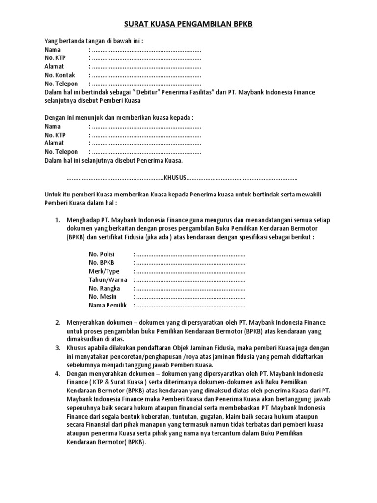 Surat Kuasa Pengambilan Bpkb Mobil Di Acc from imgv2-1-f.scribdassets.com Surat kuasa adalah surat yang dibuat untuk memberikan wewenang kepada orang lain dari seseorang. Bagi yang membutuhkan surat seperti ini silahkan lihat langsung format atau contoh surat kuasa bpkb motor berikut. File tersebut tentu akan memudahkan anda karena mengonsep surat kuasa tentunya akan menggunakan microsoft office. Contoh surat kuasa juga banyak sekali jenisnya, dari perorangan, kedinasan, istimewah, pengambilan bpkb dan masih banyak lagi contohnya. Kebanyakan surat kuasa pengambilan bpkb termasuk surat kuasa perseorangan, karena dibuat oleh seorang. Sehingga anda harus mengetahui beberapa persyaratannya terlebih dahulu supaya tidak ada kendala nantinya. Download file blangko contoh surat kuasa pengambilan bpkb motor dan mobil dalam format word gratis tinggal edit untuk berbagai leasing di indonesia. Batu ampar, 10 juli 1975 untuk mengambil bpkb motor dengan rincian sebagai berikut: